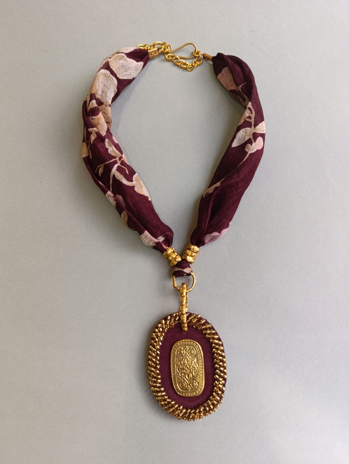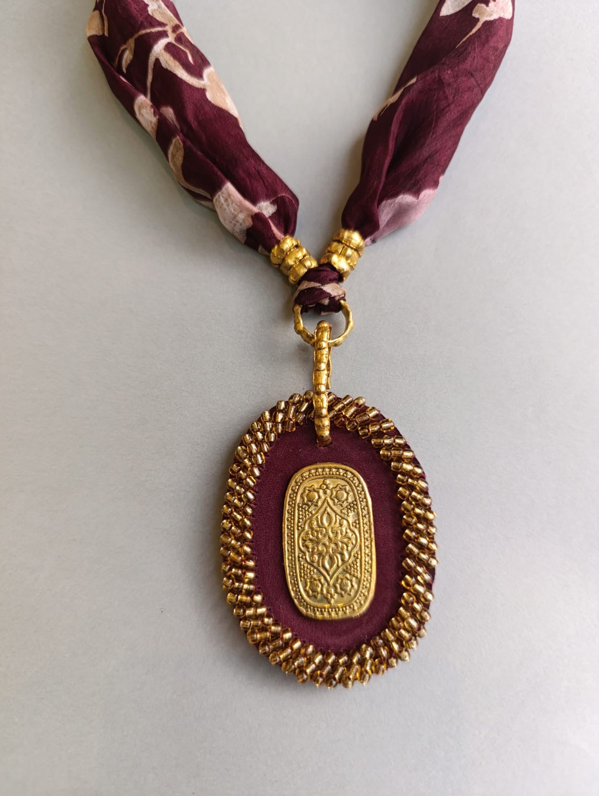 عقد متوسط الطول مصنوع يدويا من القماش مع النحاس والجلد الطبيعي