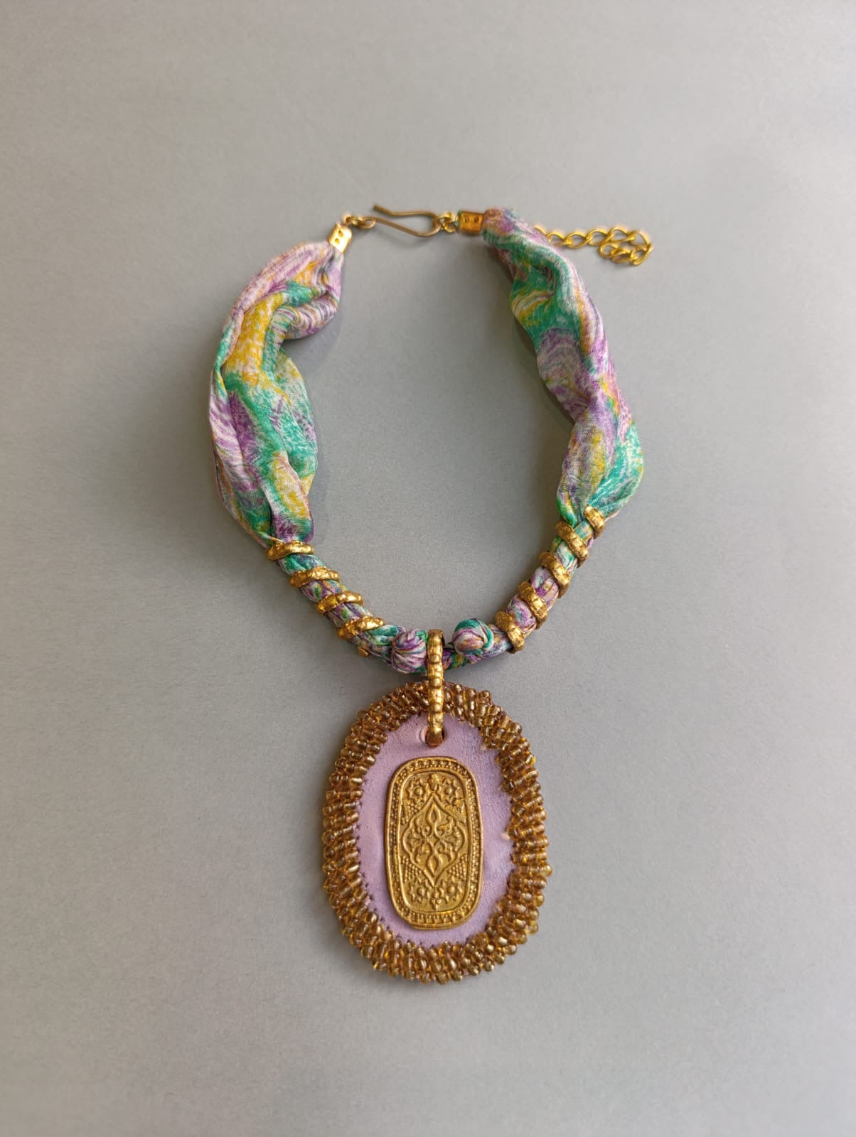 عقد متوسط الطول مصنوع يدويا من القماش مع النحاس والجلد الطبيعي