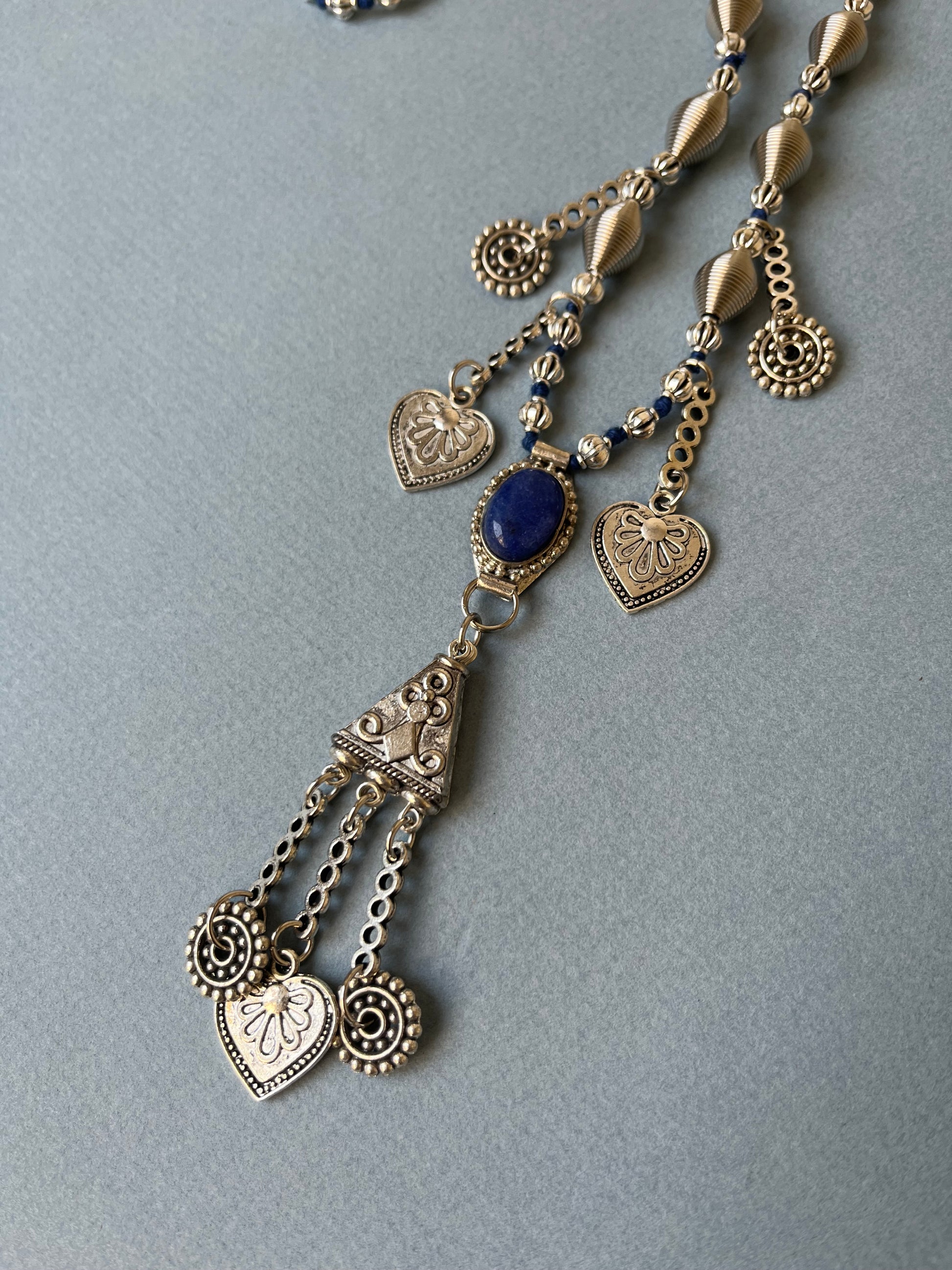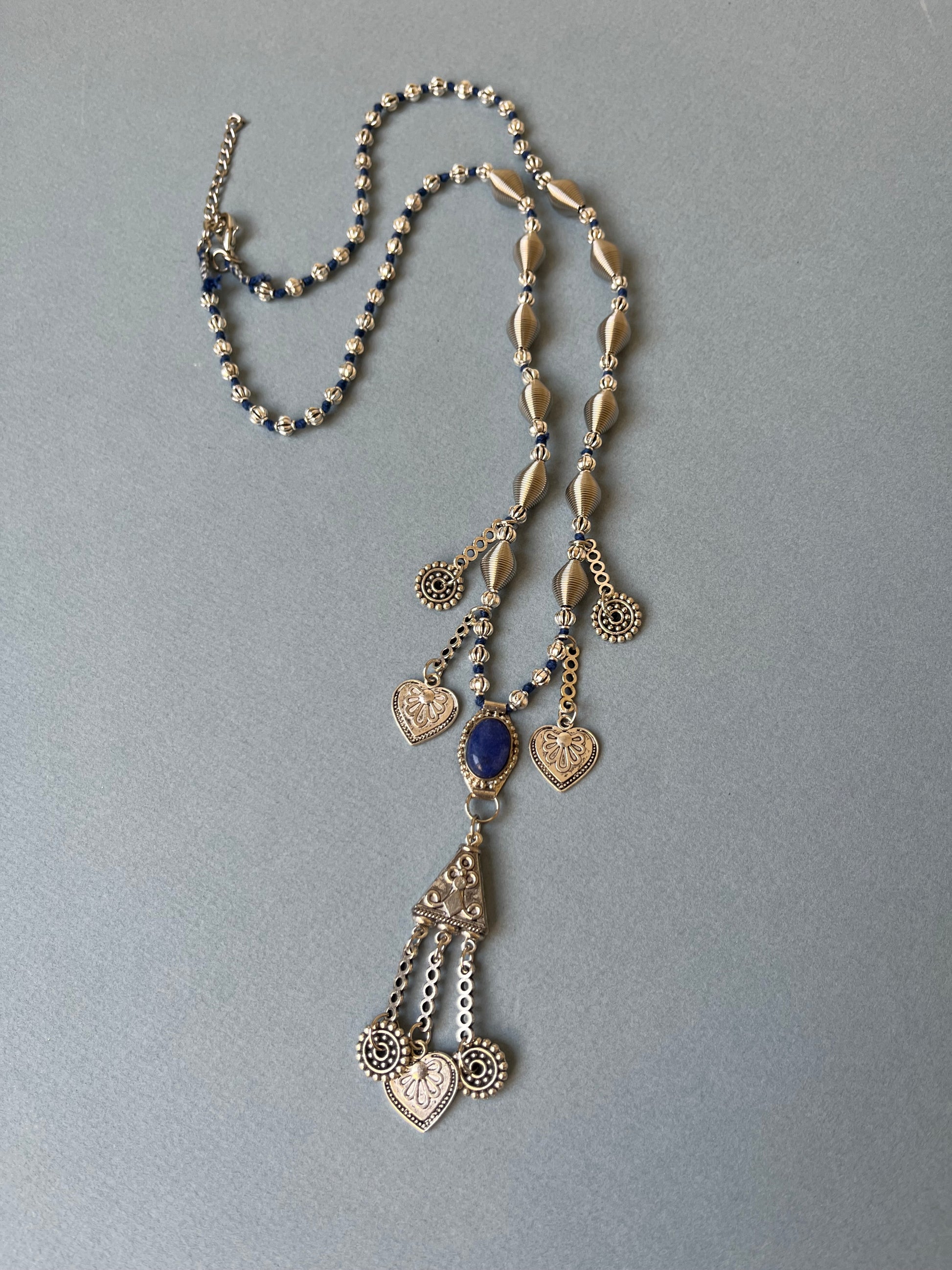 سلسلة طويلة من المعدن المطلي نيكل وحجر عقيق ازرق